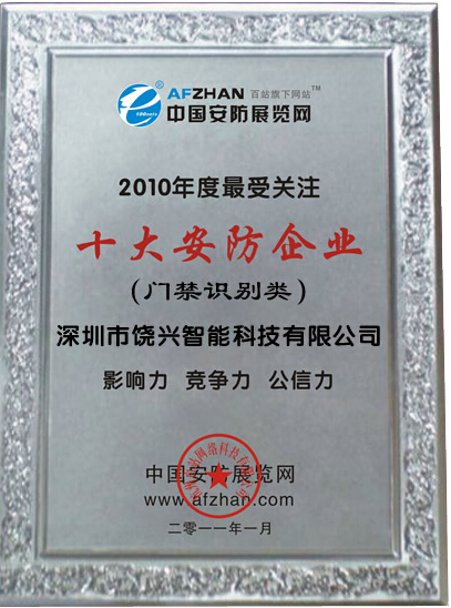获2010年度最受关注十大安防企业荣誉