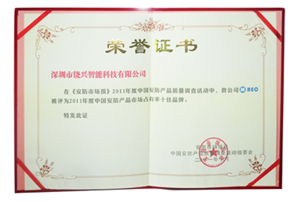 深圳饶兴智能荣获2011年质量调查十佳品牌证书