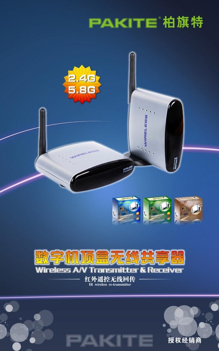 柏旗特 PAT-240 数字机顶盒无线共享器由发射器(Transmitter)和接收器(Receiver)组成。采用国际先进的2.4GHz无线传输方案,传输距离远,抗干扰和移动性强。可将DVD、DVR、摄像头、IPTV、卫星机顶盒、数字电视机顶盒等音视频信号,以无线的方式传输并在远端接收,输入到电视机上显示。同时能在接收器端使用红外遥控器遥控操作,达到异地无线遥控设备的功能。让您轻松实现高清影音无线共享,享受到自由自在的高保真视听效果。