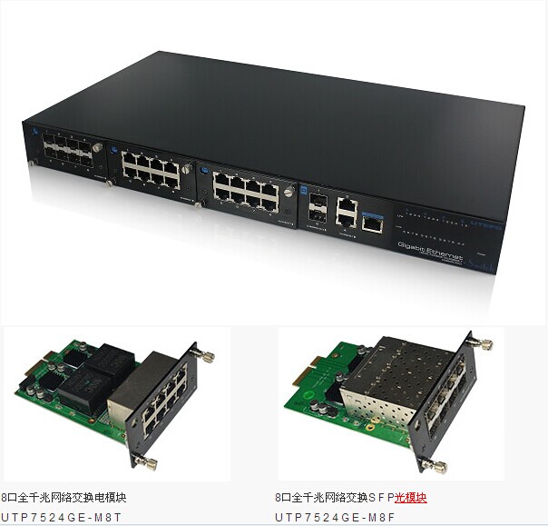 优特普UTP7524GE-MX是一款全千兆网管型模块化汇聚以太网交换机。该产品可提供24个下联千兆电口或光口,上联2光2电千兆端口。下联1-24口支持光或电模块随意配置(8光口、8电口可插拔式模块)。