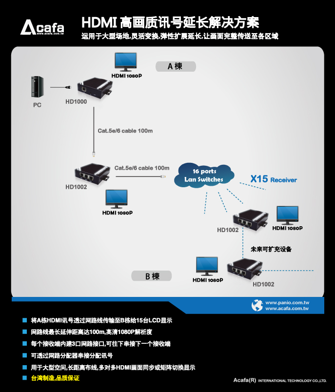 | 可将HDMI讯号源透过Cat5e网路线延伸,最远达1000米(1080P)-10级串接 | |