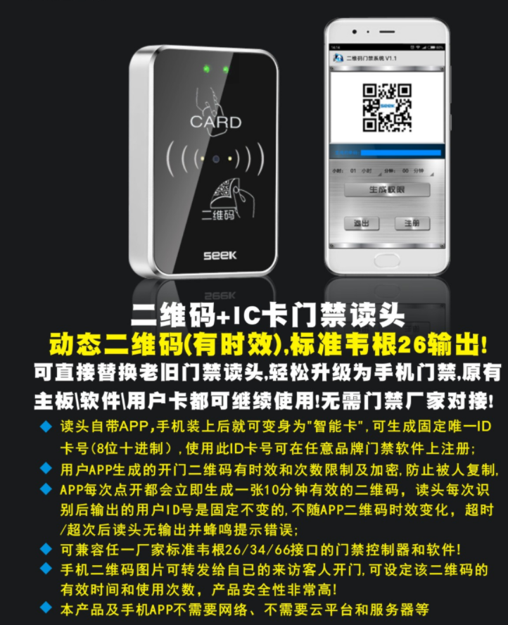 本二维码密码IC卡读头或门禁一体机配合我司的微信小程序使用,采用动态二维码作为用户的身份凭证(也支持IC卡、身份证、手机NFC、银行卡等),业主用户使用的动态二维码都是短时有效,不怕被人复制或盗拍,安全性非常高!