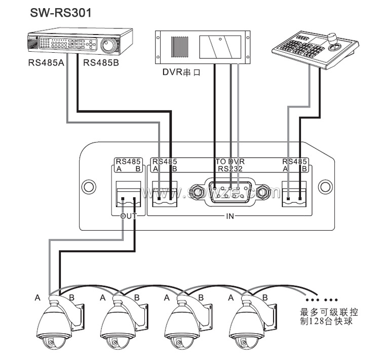 1个RS232、2个RS485输入,1个RS485输出;能让多台以RS485或422通讯的不同控制设备(如:硬盘录像机、 矩阵、控制键盘等)都能控制挂在同一总线上的多个受控设备,解决多台控制设备之间的操作冲突问题。