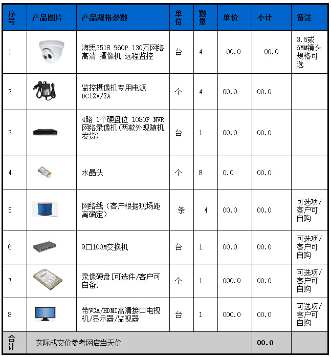 960P 4路视频监控套餐 网络高清监控套餐 家用专用监控套餐