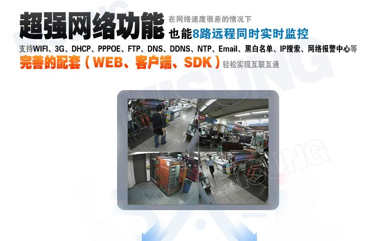 网络功能: 内置WEB SERVER,拥有Email报警邮件,FTP,DDNS动态域名,PPPOE拨号,DHCP自动获取IP地址,NTP自动校时,UPNP端口自动映射,IP黑白名单等功能