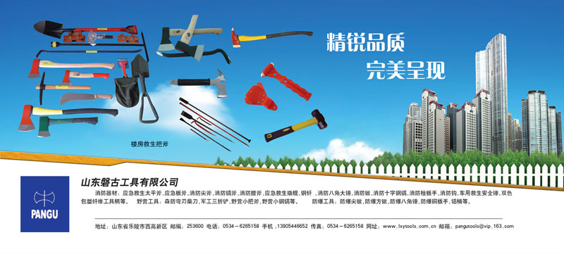 多功能消防腰斧,应急救生太平斧,应急救生大板斧,消防尖斧,消防镐斧,楼房救生把斧,消防腰斧,应急救生撬棍,野营帐篷钢订,钢钎 ,消防八角大锤,消防锨,消防十字钢镐,消防栓板手,消防用吸水管板手,消防钩,客车用救生安全锤HR-A,工程 机械车辆逃生应急安全锤HR-T,地铁逃生安全锤HR-T,消防水带卡子,双色包塑纤维工具柄,森防弯刃柴刀,野营军工三折铲,野营小把斧,野营小钢镐等。获TUV/GS证书并且企业通过了ISO 9000认证。