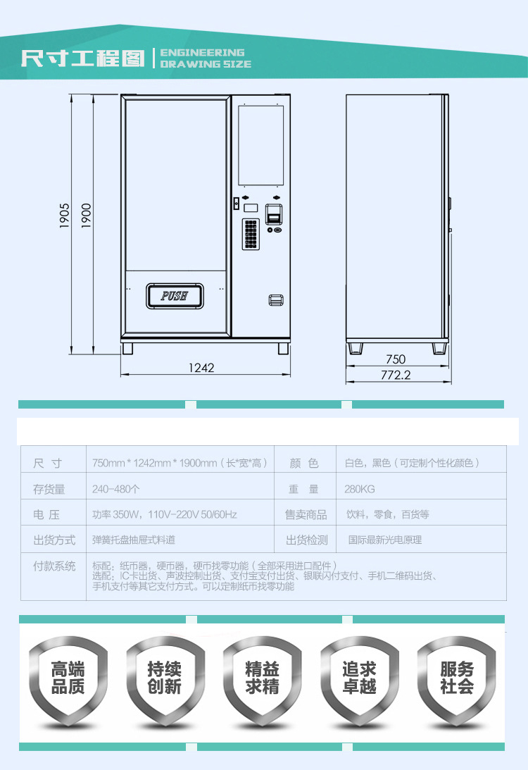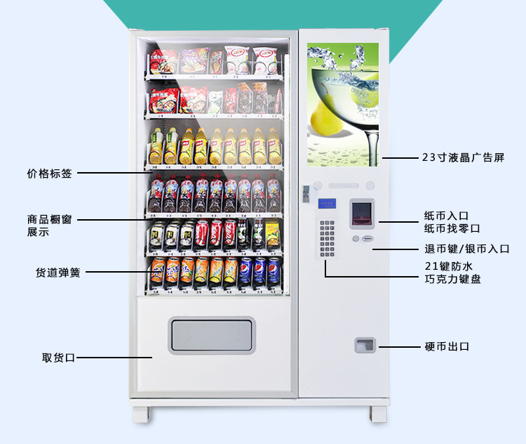 ● 可同时售卖多种小食品及能制冷的罐装、瓶装、盒装、袋装等饮料,商品适用范围广,经济收益高。