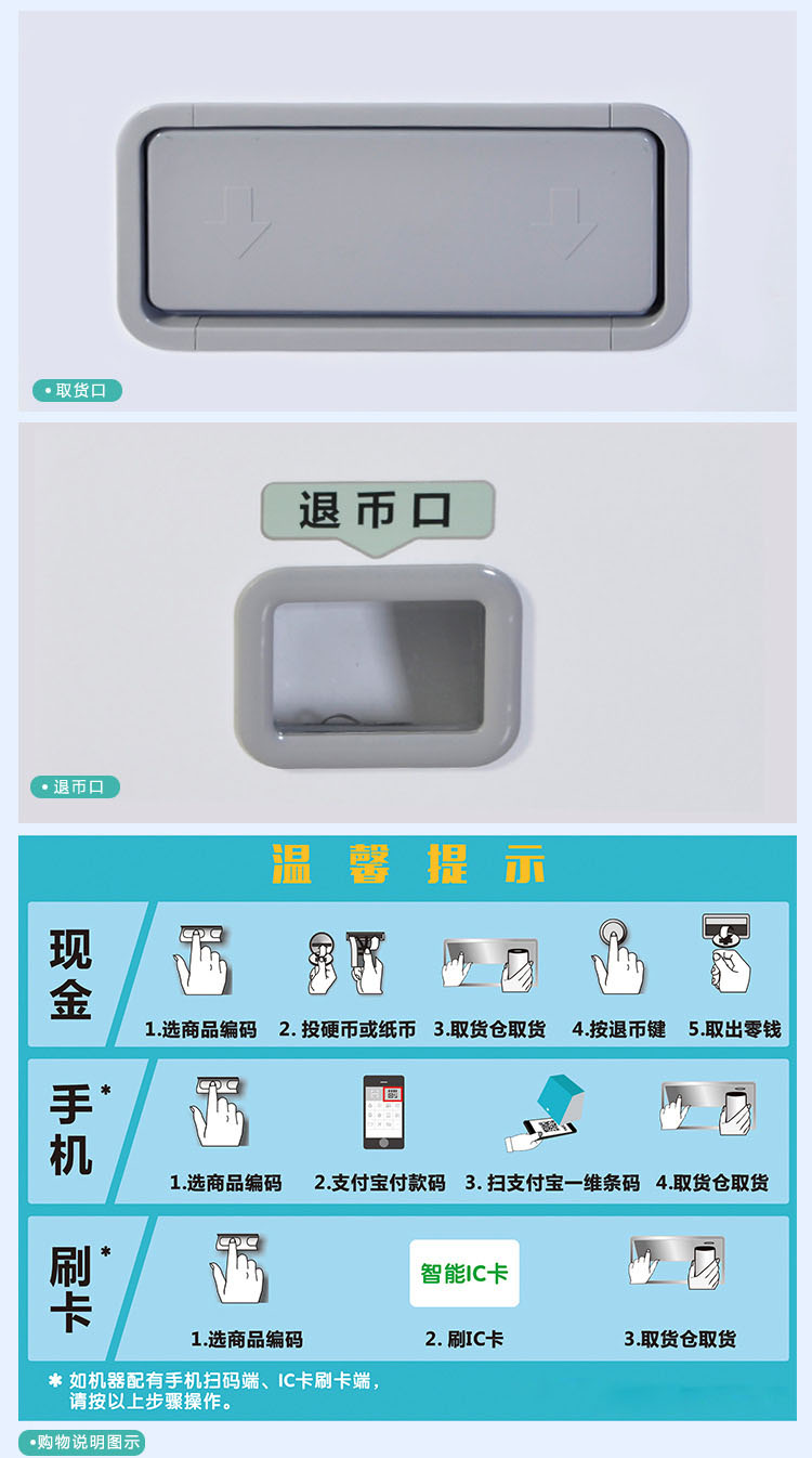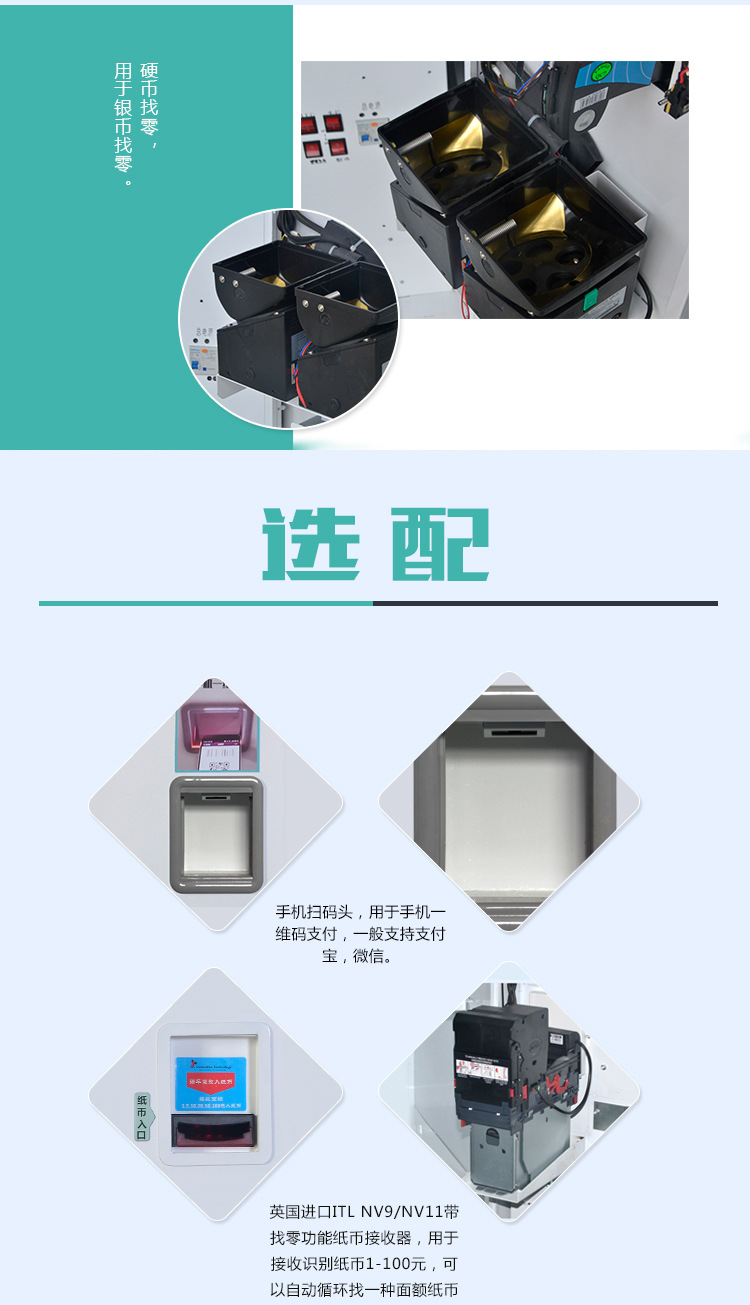 ● 支持支付宝、微信、京东钱包、纸币,硬币支付及硬币找零功能。