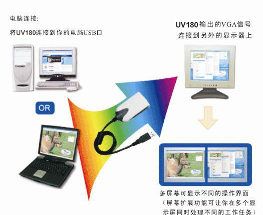•笔记本电脑可透過USB外接显示卡同步画面的模式连接投影机,来播放展示。