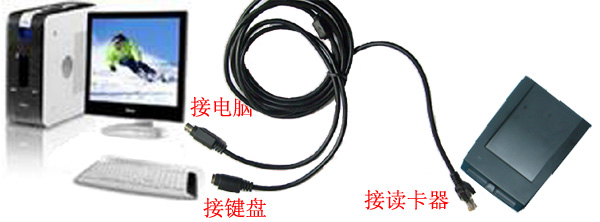 拔出电脑键盘的PS/2插头,将读卡器连接线的一头插到电脑上,将原键盘的PS/2插头对接到读卡器连线另一头。读卡器连线的网络线水晶头插到读卡器上,读卡器将“滴滴”二声并闪灯一下,表示上电成功,连接示意图如下: