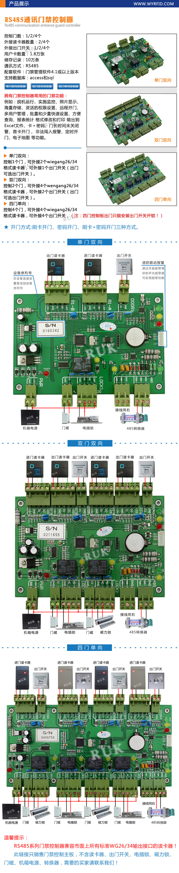 2、特殊功能 2.1报警功能:通过外接报警模块和声光报警器可实现以下报警功能 ●无效卡刷卡报警:就是没有注册权限的卡刷卡会报警。 ●门长时间未关报警:就是门长时间没有关闭情况下,自动报警。 ●火警:在收到消防信号后,自动打开门并报警。 ●非法闯入报警:就是没有资格权限的人,通过其他非法方式闯入,会自动报警。 ●胁迫报警:就是被非法人员胁迫进入时报警。 ●智能联动报警。 2.2多卡开门功能:要求多个人持有注册卡,依次刷卡才能开门。 2.3首卡开门功能:就是在规定的时间内,首卡的卡刷卡后,门可以转换相应的状态。 2.4临时开门:可把卡的有效时间设置到几点几分,其他时间就不可以开门。 2.5反潜回、防尾随:执卡者从某个门刷卡进来就必须从某个门刷卡出去,如果进门未刷卡,尾随别人进来者,出门刷卡时系统就不准他出去。 2.6定时开门:在规定的时间范围内,门处于常开状态。 2.7自动服务功能:系统在用户设定的时间内,自动提取控制器里面的数据,无需用户手动回收数据。 2.8内外验证功能:需内卡确认后,外卡才可以开门,最多可以设置五个内卡。 2.9网络密码功能:可以通过设置网络密码,确保系统绝对安全,没有密码就无法达到访问功能 2.10 IP复位功能:一旦出现程序或其他故障,可以通过门禁控制器主板上的按键,实现IP复位功能,确保系统安全,正常运行。