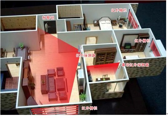 一个肉眼看不见的多束红外光栅组成的防范护栏,只要相邻两束红外光线被遮挡,立即产生报警信号并自动向