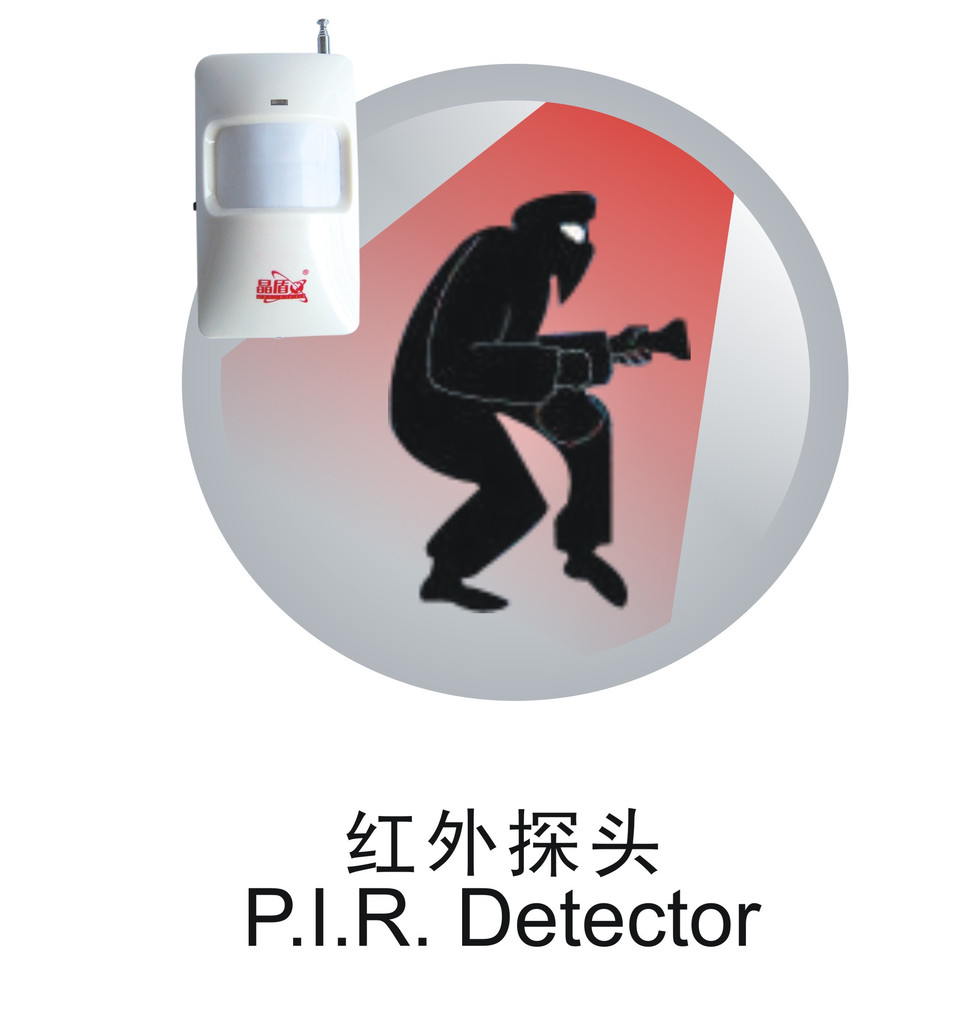 无线红外:感应到有人进入红外防区触发主机报警,红外范围前方8-10米110度角大