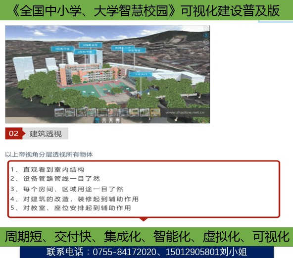 三维可视化三维可视化平台提供了一个用于在网络中发布三维可视化数据和服务的分层框架结构,允许建立可伸缩的三维可视化或LBS应用。并为可视化专题图、应用提供可视化基础支撑服务。为需要位置坐标的应用功能,通过精细定位算法提供精确的定位服务信息。