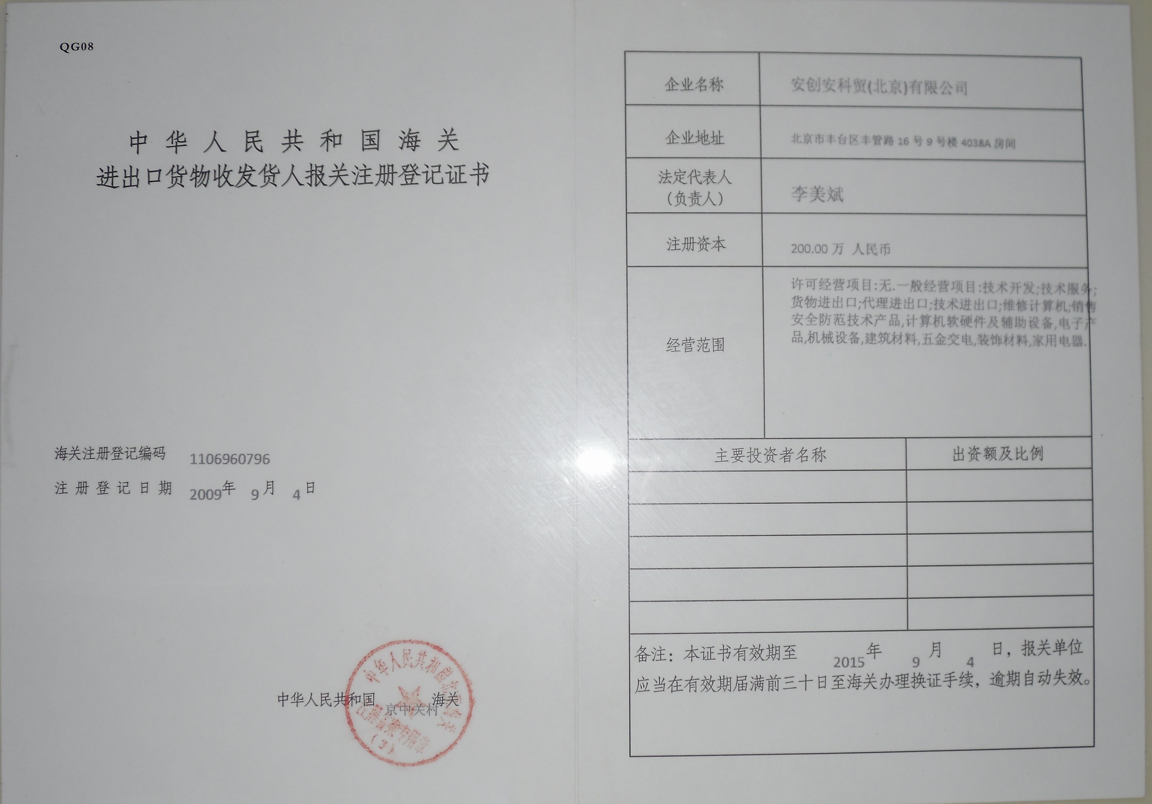 自理报检单位备案登记证书