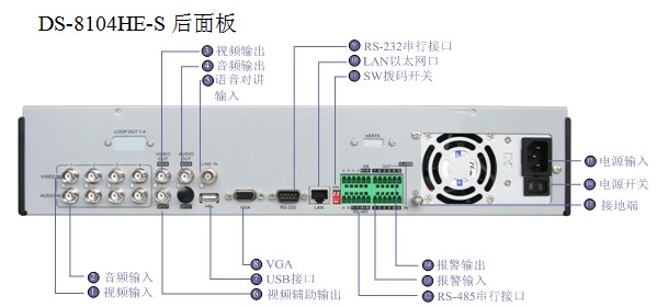 注:DS-8108HE-S后面板与DS-8116HE-S相似,仅视音频输入通道为8路。
