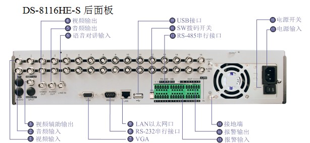 注:DS-8108HE-S后面板与DS-8116HE-S相似,仅视音频输入通道为8路。