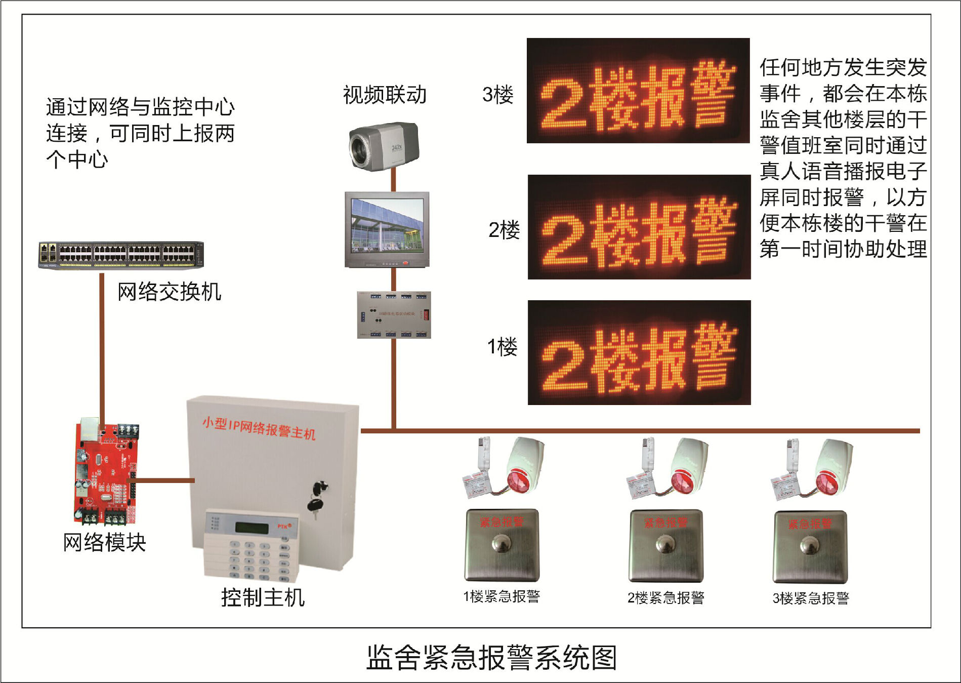 少年犯监舍楼对照以上配置,共计装3台网络主机,3个报警按钮, 3个报警显示板,15个报警闪灯。
