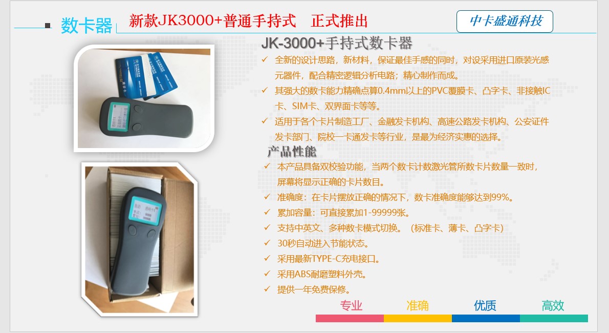 JK3000+第三代智能手持式数卡器,全新的设计,全新的理念,性能更成熟稳定,适应性更好。采用原装进口的光学元件,ARM7高性能处理器,配合精密的逻辑分析电路及计数算法,精心设计制造而成。新型TYPE-C充电接口,使用携带均很方便。其强大的数卡能力能精确点算0.25mm以上的PVC卡凸字卡、芯片卡、PET材料卡、ABS材料卡及纸卡(纸卡要求0.3MM厚度以上)。该数卡机适用于各种制造或发行信用卡、储蓄卡、智能卡、二代证、会员卡、优惠卡、电话卡等厂家或机构。目前广泛应用于国内外各行业。考虑到市场需求,公司提供纯中性的产品,提供OEM服务,详情请致电公司咨询。