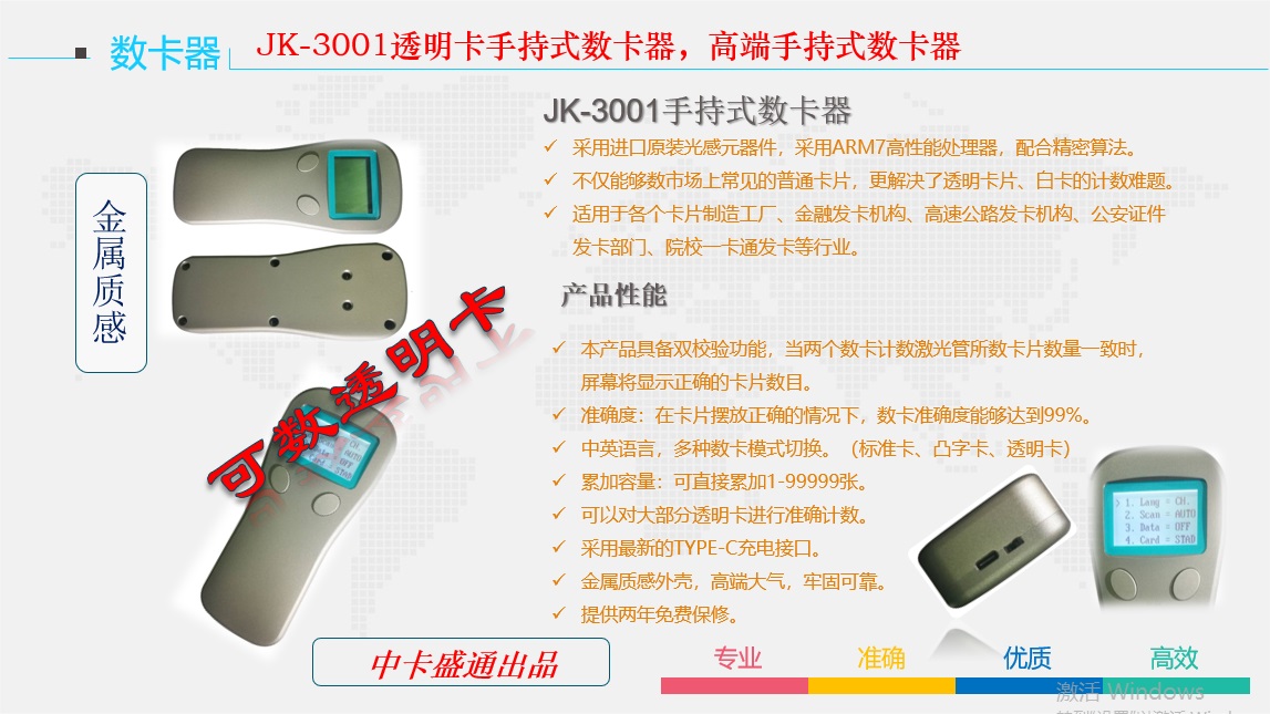 JK3000+第三代智能手持式数卡器,全新的设计,全新的理念,性能更成熟稳定,适应性更好。采用原装进口的光学元件,ARM7高性能处理器,配合精密的逻辑分析电路及计数算法,精心设计制造而成。新型TYPE-C充电接口,使用携带均很方便。其强大的数卡能力能精确点算0.25mm以上的PVC卡凸字卡、芯片卡、PET材料卡、ABS材料卡及纸卡(纸卡要求0.3MM厚度以上)。该数卡机适用于各种制造或发行信用卡、储蓄卡、智能卡、二代证、会员卡、优惠卡、电话卡等厂家或机构。目前广泛应用于国内外各行业。考虑到市场需求,公司提供纯中性的产品,提供OEM服务,详情请致电公司咨询。