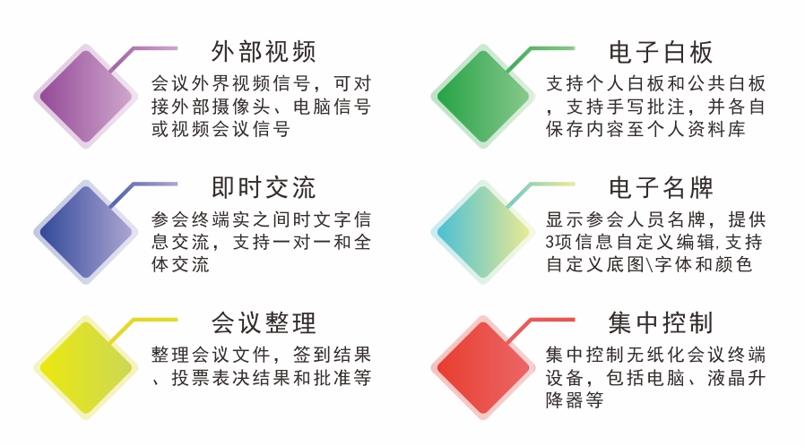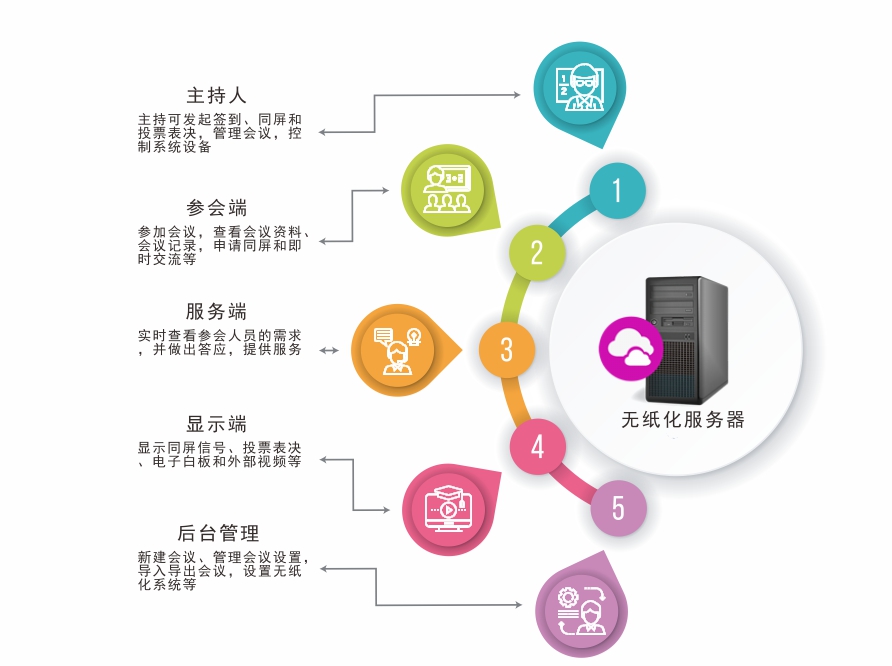 无纸化会议系统概念,提供了强大的会议管理功能,包括多会议信息制定和发布,议程提醒、会议签到、投票,会议资料共享和批注,会议同屏,会议笔记,会议互动及茶水等会议服务功能;