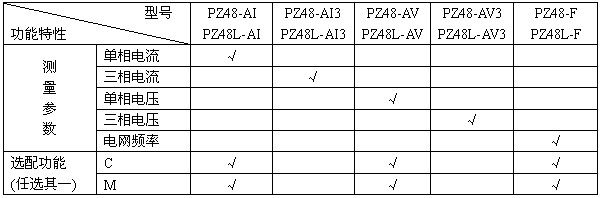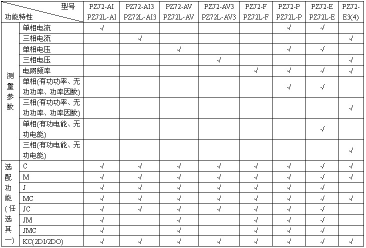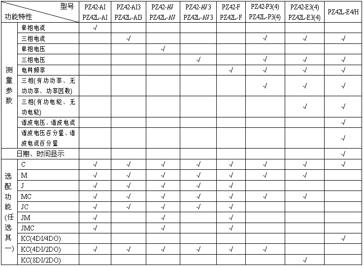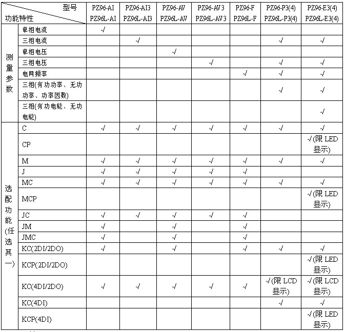 2、PZ96(L)-E3(4)在选配KC(4DI)功能时具备1路有功电能脉冲信号输出端口,在选配KC(2DI/2DO、4DI/2DO)功能时无脉冲信号输出端口;