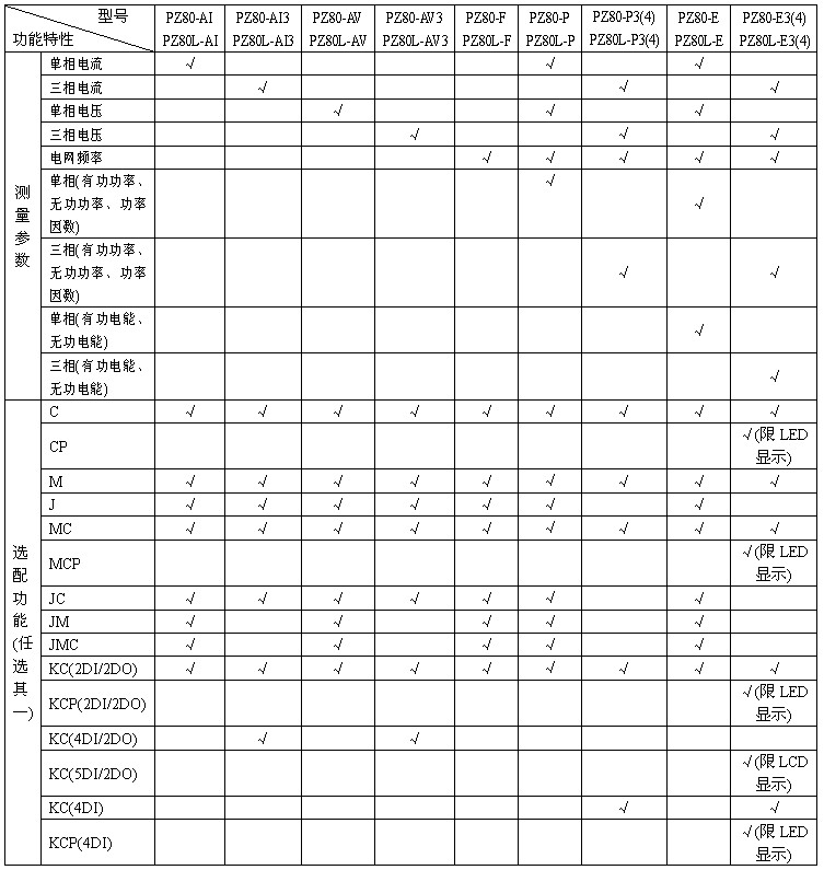 3、PZ80(L)-E3(4)在选配KC(4DI)功能时具备1路有功电能脉冲信号输出端口,在选配KC(2DI/2DO、5DI/2DO)功能时无脉冲信号输出端口;