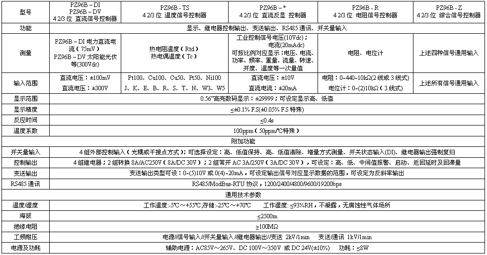 PZ96B系列数显控制仪表是一种用于电力及工业自动化测量的智能仪表,集多种测量功能于一身,一表多用,可测量直流电流、直流电压、各种类型热电偶、热电阻、电阻传感器,带DC24V电源输出可给外部两线式变送器直接供电。仪表带有多种可选功能:RS485接口、模拟量输出、开关量输入、继电器报警输出等。广泛应用于电力直流屏监测,工业自动化控制领域的压力、温度、位移等的测量和控制。