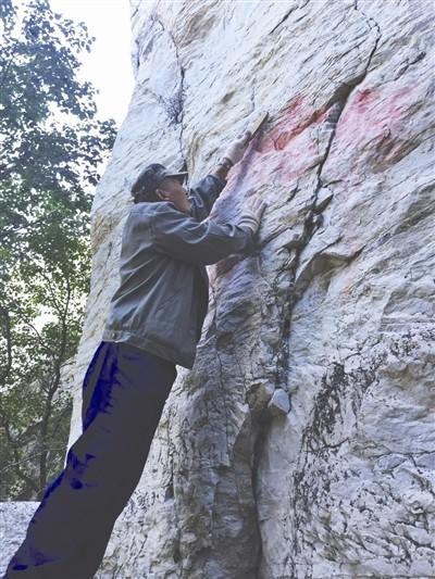 用了三个小时,陈志成把景区那块被当地人称为“狮子头”的景观石基本都清洗干净了。长期爬山的他,在石壁上下并不是太费劲。而在另一面巨大的石壁上,陈志成之前写下了“仁者乐山”四个特大的红字,都是用红漆喷的。当初为了显眼,字喷得很大,可清洗起来就困难多了。陈志成需要爬上一块石壁边上的巨石,才能方便贴着石壁用刷子刷。一点点往下掉的红色印迹,就如同陈志成内心的罪恶感。为了擦去石壁边缘处的印迹,陈志成的右脚顶住石壁作为支撑点,努力地把手伸得长些更长些。这个危险的姿势,让已经连续和陈志成打了三天交道的巡山员老高有些担心,不断地喊话。“注意安全,注意安全。”
