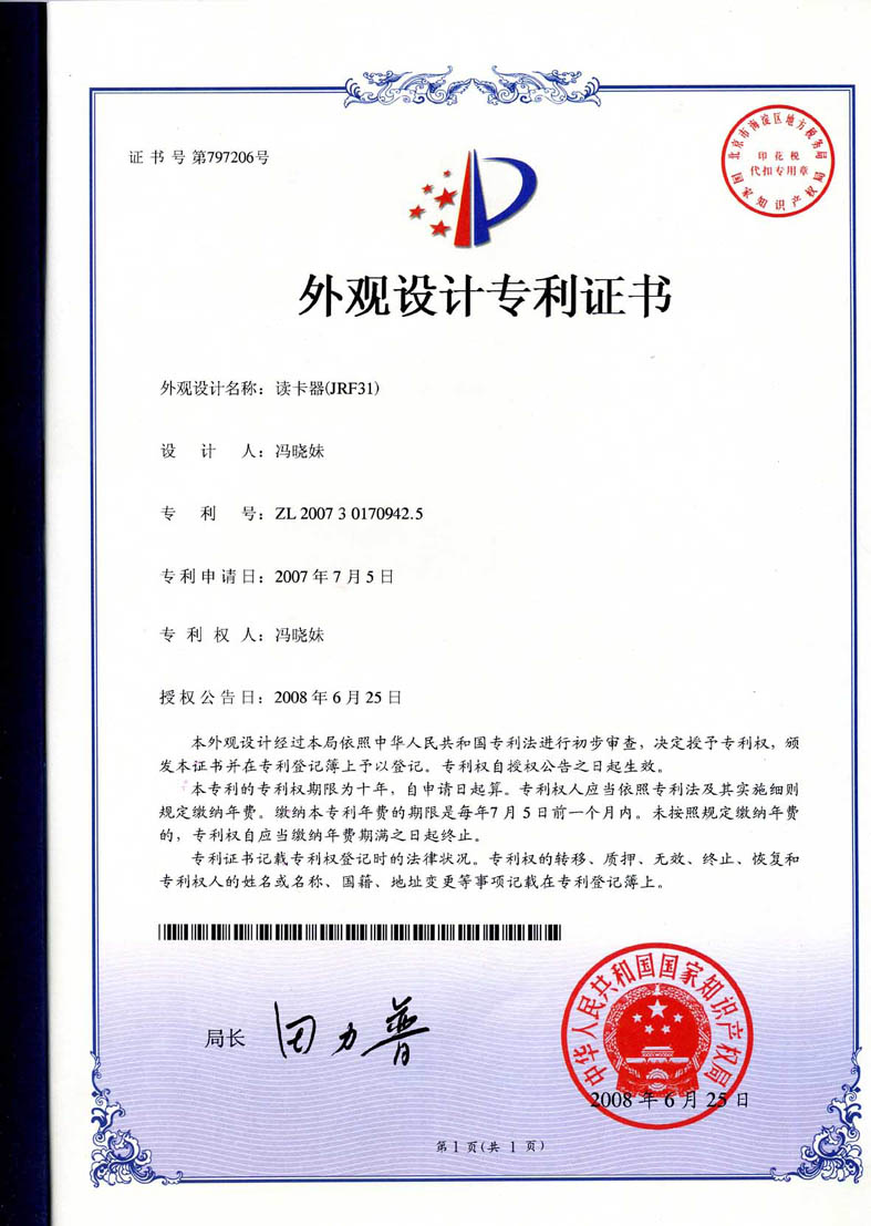 铁路产品外观设计专利证书