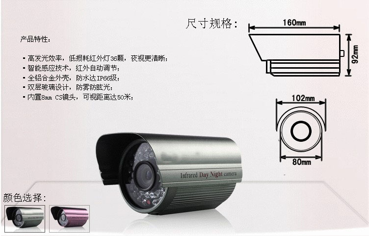 | 色彩 | 彩转黑(白天彩色,红外灯开启后为黑白) | |||