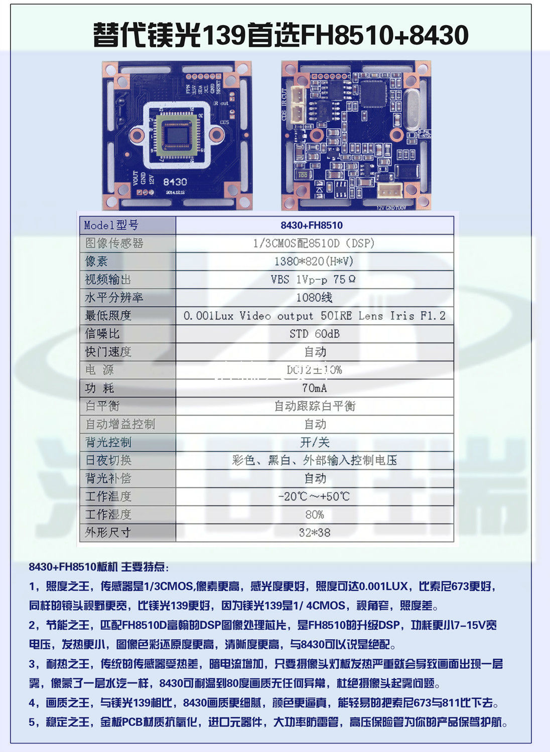 1/3CMOS高清低照节能耐热稳定模组 8510+8430 32.38兼容款