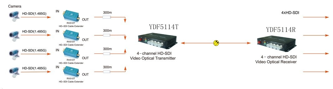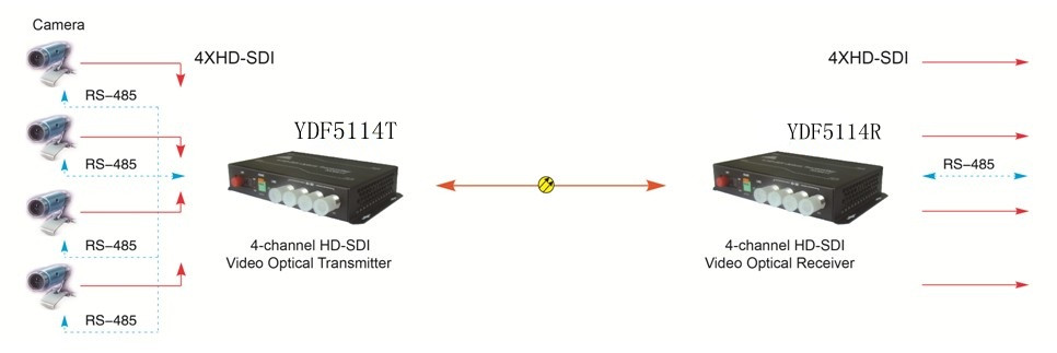 YDF5114是一款低成本、高可靠性4路HD-SDI视频光端机,采用新亚缔HD-VLFCTM(High Definition Visual Loss-Free Coding)视觉无损编码技术,可实现4路高清视频信号在一根光纤上的视觉无损传输,同时提供1路RS485数据信号的双向传输。 YDF5114分为YDF5114T(4路HD-SDI视频光发射机)和YDF5114R(4路HD-SDI视频光接收机),二者成对使用,可广泛应用于电视现场转播、高清视频会议、高清视频监控等领域。