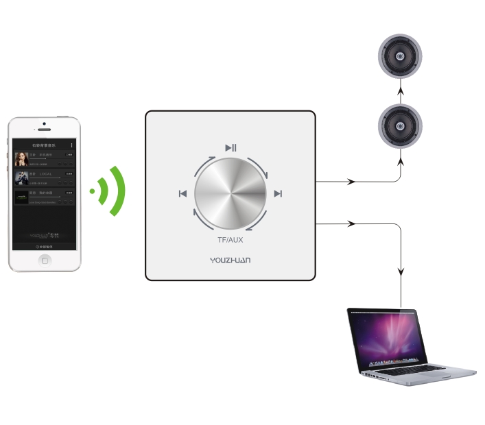 YZ-52音乐控制器集嵌入墙体安装,不占用空间,不影响装饰,通过一个或多个音源,将高保真的立体声音乐传送到每个房间(客厅、卧室、餐厅、书记、洗手间、厨房、阳台).标准86底盒安装,集成电源、数字功放、TF卡、AUX、云音乐,可选RS485通讯,支持ALRPLAY、DLNA协议。支持QQ音乐、百度音乐、天天动听、喜马拉雅等音乐推送。