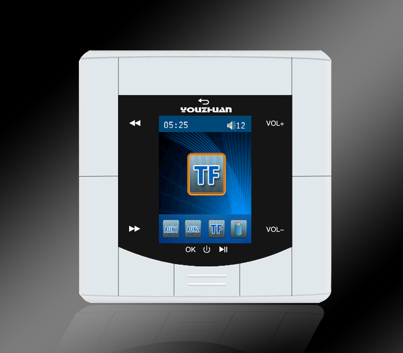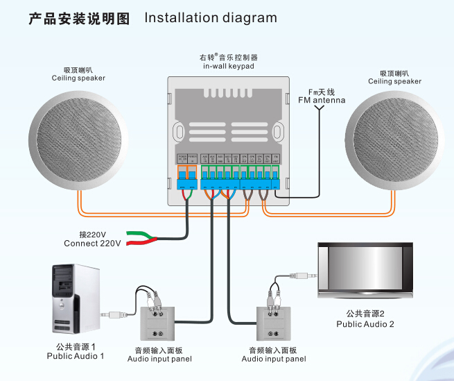 3、 多音源选择功能:2路前端公共音源输入(AUX1/AUX2)和4路本地音源:内置FM/USB输入播放/TF卡存储播放/3.5音频接口)。