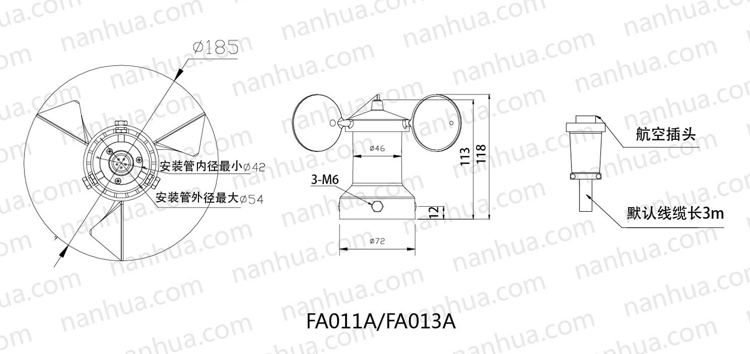 注意:风速传感器要竖直安装在水平面上,风杯在上方,传感器要求固定牢靠、稳定,以防脱落。