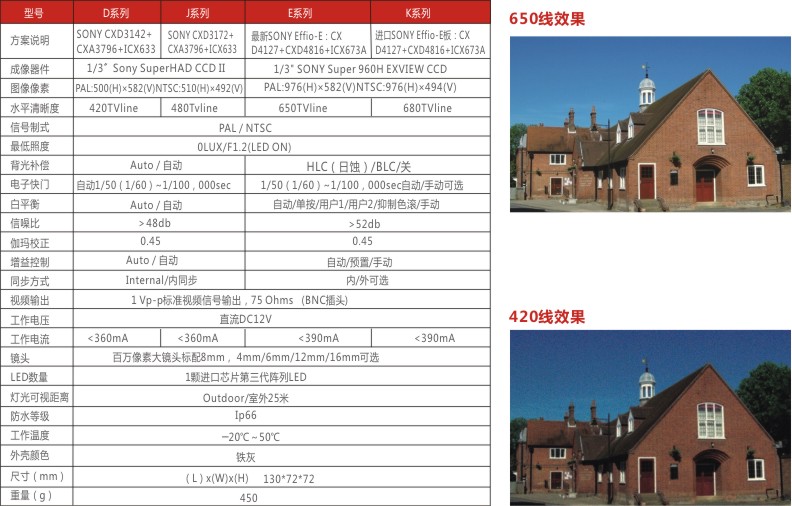 *SONY原装最新650线EFFIO方案:CXD4127+CXD4816+ICX673CCD,色彩更真实,清晰度更高。带线控菜单设置,可以调整出你想要的图像效果。