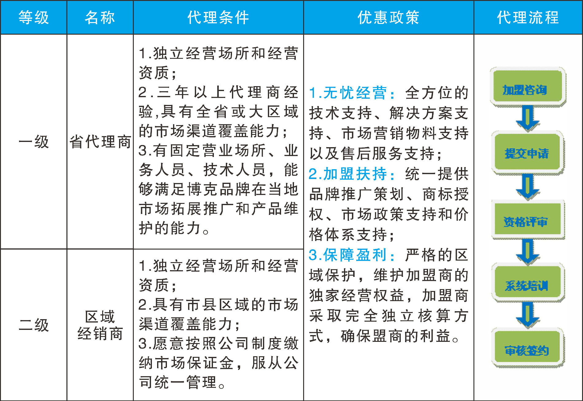 博克以020模式,在全国各地建有一级渠道31家经营部,分布于全国25个省、直辖市、自治区的省会或副省级城市,布下绵密完善的渠道系统,18年的经营累积了大量的客户,为更好服务于客户,满足市场需求, 博克致力于建设全国代理商。代理商不仅能够以极具竞争力的价格获得产品经销权,还能享受公司全方位的服务支持。欢迎您的加入!
