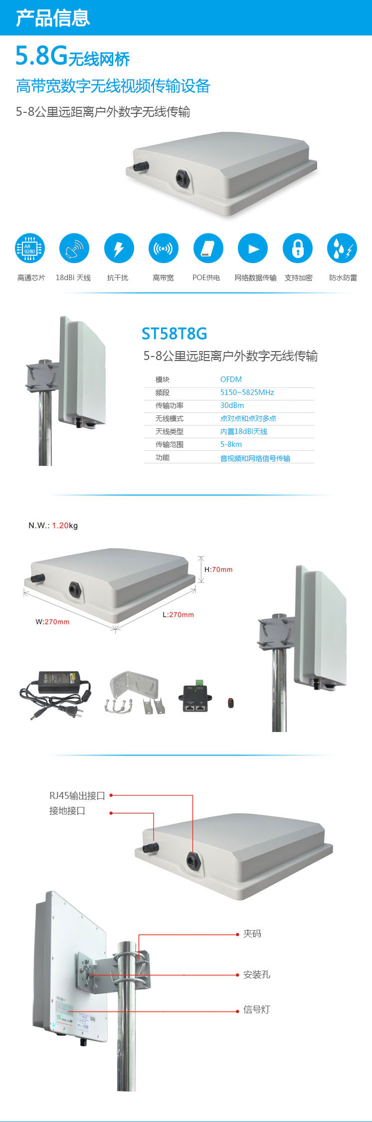 数字无线传输设备,接口形式为RJ45网络协议接口,适合传输基于网络标准的数据流。 可以跟ST58T8G系列设备互相通信也可以与ST58T8VC和ST58T8VR互相通信,实际使用可根据实际情况进行搭配使用,支持AP、WDS、Client三种工作模式,适合传输大容量数据和高清视频信号。 ※该设备已通过CE认证和无线电委员会认证