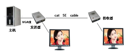 本产品由发送器和接收器组成,能通过单根网线把计算机主机的音频和显示视频接口延长最远达600米,图例如下: