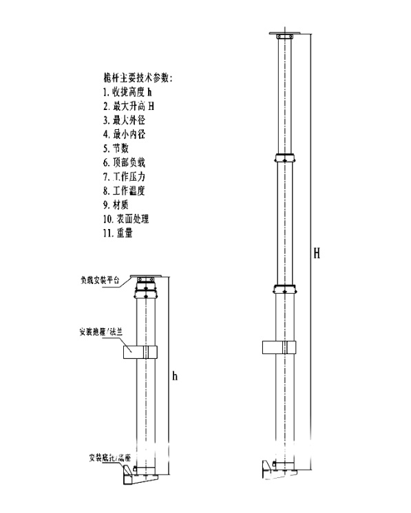 举升最大高度(展开高度):1-30M(可根据需求进行定制,常用规格见附表);2. 闭合高度:500MM-4000MM(可定制);3. 载重:最大载重500Kg,最小载重5Kg(参照常用规格表);4. 升降时间:2-3M/min;5. 最大偏摆角度:5°;6. 最大扭转角度:45mrad;7. 抗风等级:8级风能正常工作,10级风不破坏;以上参数均为公司通用型号升降杆的参数。