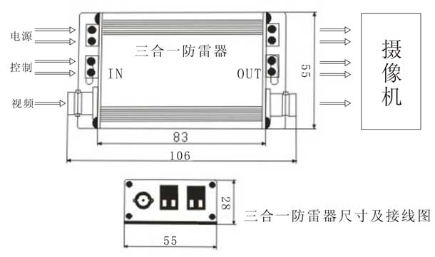 1、三合一防雷器串联安装在监控摄像机端口前(“IN”标识端接入线路,“OUT”标识端与被保护摄像机相连接),然后直接接地。