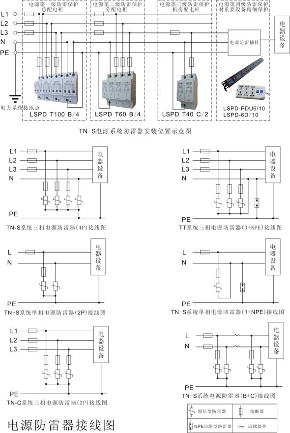 LSPD T60 B/2,LSPD T60 B/4 B级单相/三相电源防雷器(SPD/避雷器/防雷模块/浪涌保护器/电涌保护器/过电压保护器)适用于交流50Hz/60Hz,380V及以下的TN-S、TN-C-S、TT、IT、等供电系统的防雷保护,用于LPZOA区或LPZOB区与LPZ1区交界处,其设计依据符合GB18802.1,IEC61643-1技术标准,外壳设计可方便地安装在35mm电气导轨上,该产品内置失效脱离装置,当电涌保护器因过流过热;击穿失效时,失效脱离装置能自动的将其从电网上脱离,同时可视告警指示窗口由白色(正常)变成红色(故障),可视告警指示模块可在有工作电压情况下更换。