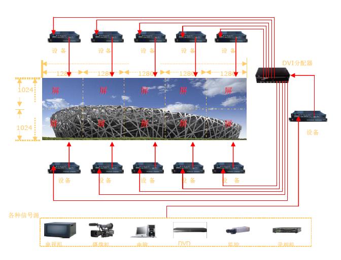 把6400*2048 点的大屏平均分成10 个独立小屏,大小都为1280*1024如上图,每个小屏要求接的发送卡能够支持1280*1024,每个小屏由各自的视频处理器控制。