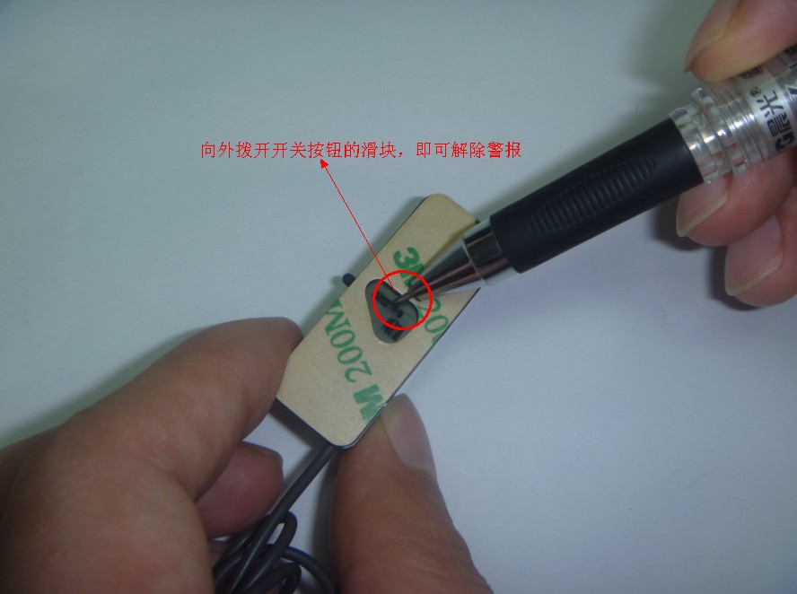 用圆珠笔尖或其他针尖物品,向外拨开开关按钮的滑块,即可解除警报。