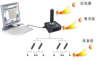 工作流程: 巡检人员手持巡检器,沿着规定的线路巡查,同时在规定的时间里到达巡检地点,使用巡检器轻轻触碰指定的信息钮,当看到灯光提示时,巡检器会自动记录到达该地点的时间和人员。然后用USB通讯座将巡检器连接到计算机上,将数据上传到管理软件的数据库中,管理软件对巡检数据进行自动分析并智能处理,由此实现对巡检工作的科学管理。