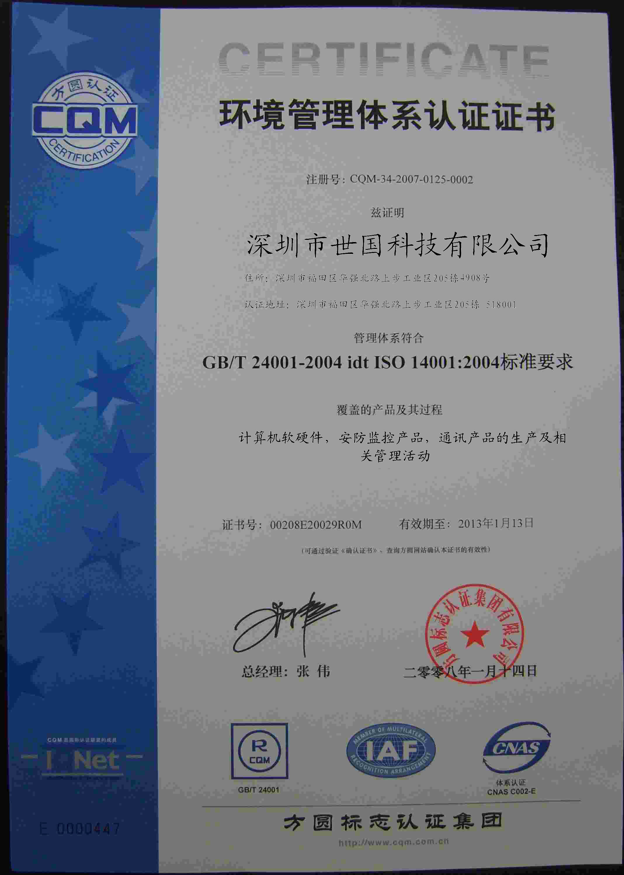 环境管理体系认证证书