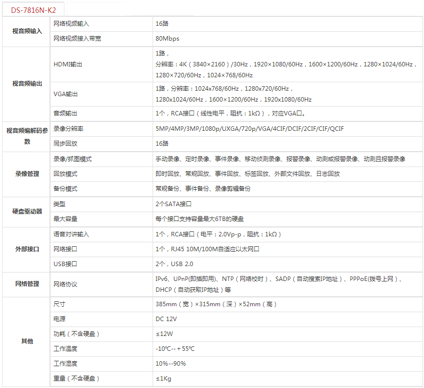 海康威视16路网络硬盘录像机DS-7816N-K2