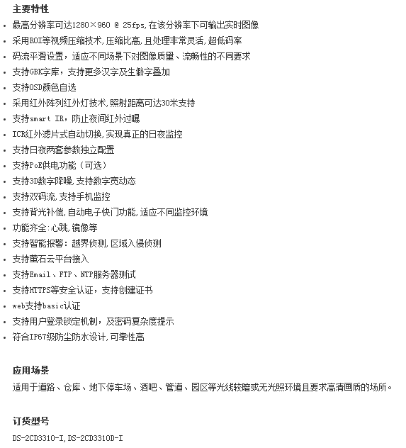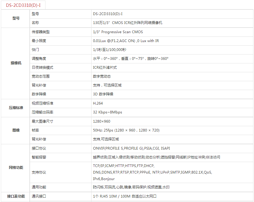 海康威视130万像素红外阵列网络半球摄像机DS-2CD3310(D)-I