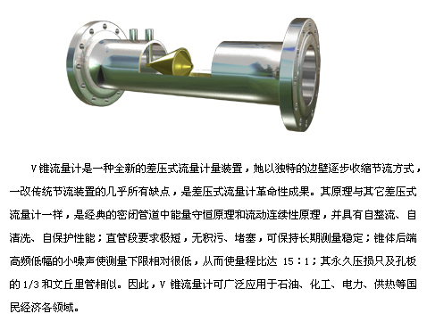 由V锥传感器和差压变送器组成。有分体型安装和一体型安装两种结构。